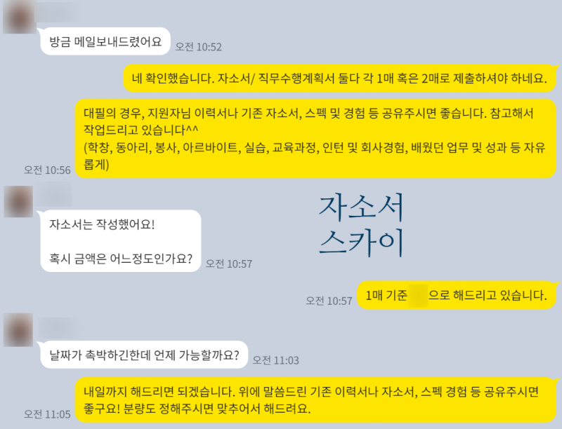 안녕하세요! 여러분의 성공적인 취업을 돕는 자기소개서 컨설팅 전문가입니다.