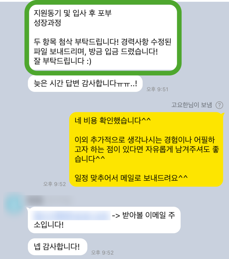 • >> 비용 결제 및 자료 (이력서, 기존 자기소개서, 관련 경험 등) 전달 📧