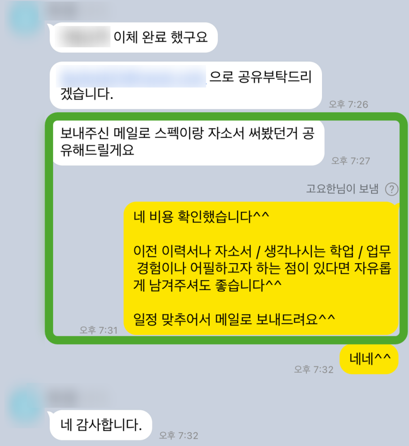 >> 1단계: 상담 문의 및 상황 공유 (희망하는 회사/직무, 마감 기한, 현재 작성된 자소서 초안 등)