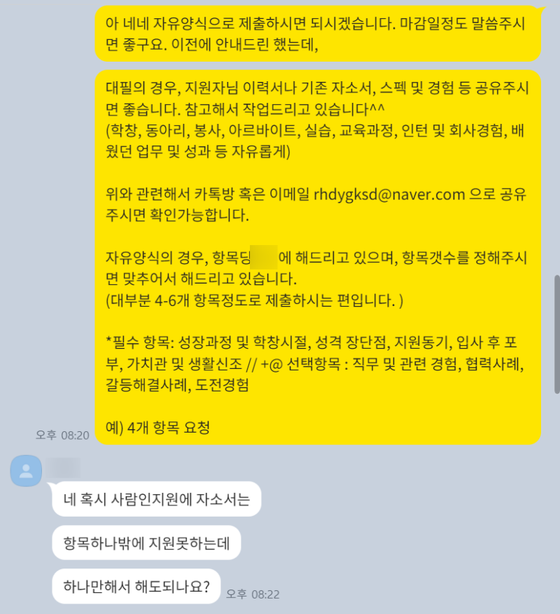 - >> 이력서 및 자기소개서(초안/작성본) 전달: 지원 직무 및 기업에 맞춰 준비된 자료를 보내주세요.