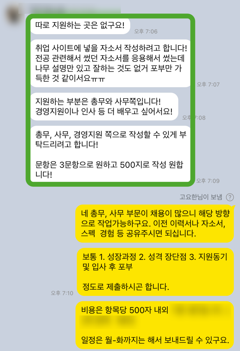 저는 자기소개서 첨삭, 대필, 면접 컨설팅 등 취업에 필요한 모든 과정을 맞춤형으로 지원하고 있습니다. 저의 전문적인 지식과 경험을 바탕으로, 여러분의 성공적인 취업을 돕겠습니다. 지금 바로 문의하세요!