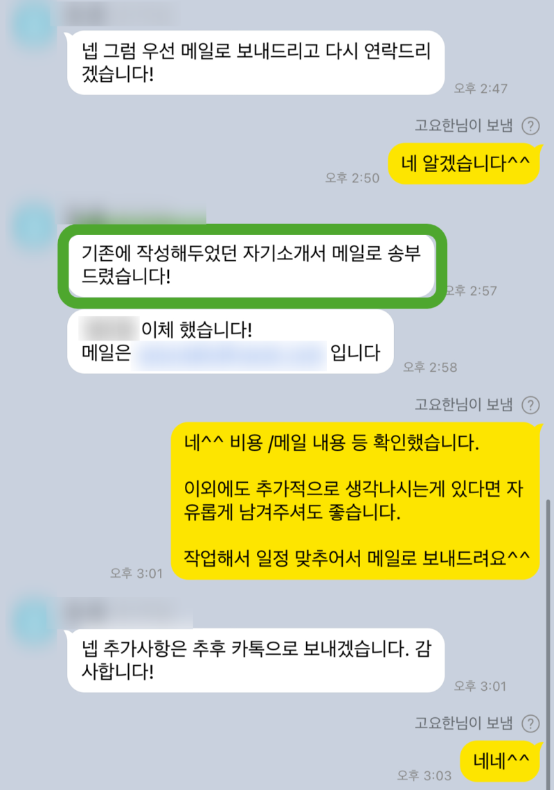 제가 진행하는 서비스는 1. 취업 자기소개서 첨삭 및 대행 2. 학업계획서 3. 경력기술서 및 직무수행계획서 진행 4. 면접컨설팅 이 모든 것을 아우르고 있구요! 단순히 글만 쓰는 게 아니라, 지원하시는 회사와 직무에 대한 깊이 있는 분석을 통해 ‘합격하는 자소서’를 만들어 드리는 데 집중하고 있답니다. 😉