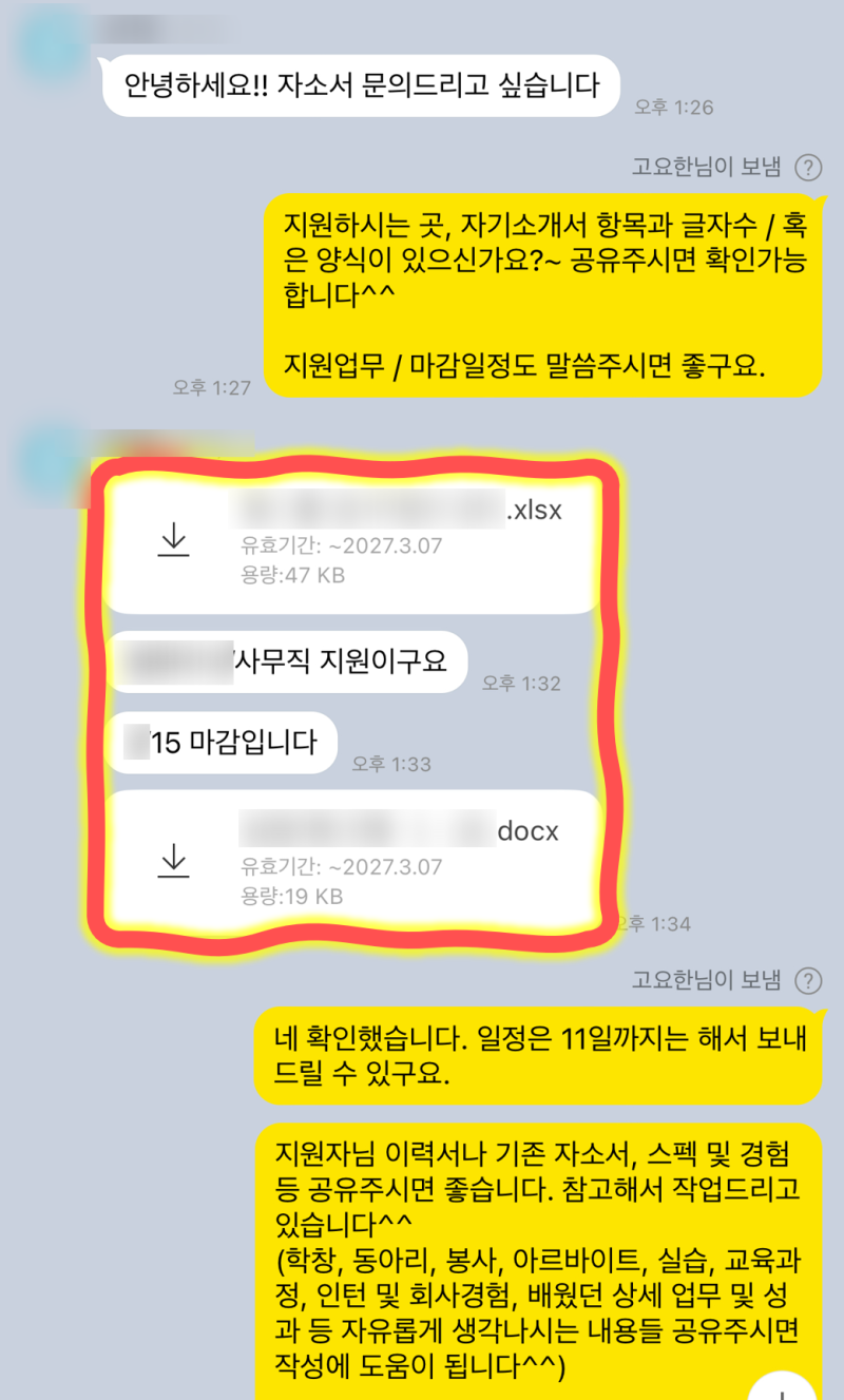 • >> 1단계: 초기 상담 및 자료 공유 (지원 직무, 회사, 이력서, 기존 자기소개서, 희망 사항 등 상세 정보 공유)